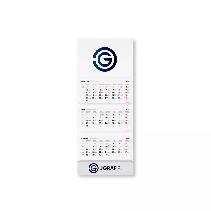Kalendarz trójdzielny z wypukłą główką o grubości 2mm oraz kartonu, bigowanego w trzech miejscach. Główka kalendarza posiada otwór na wskroś. W kalendariach znajdują się święta, imieniny, niedziele handlowe (pobierz kalendarium).